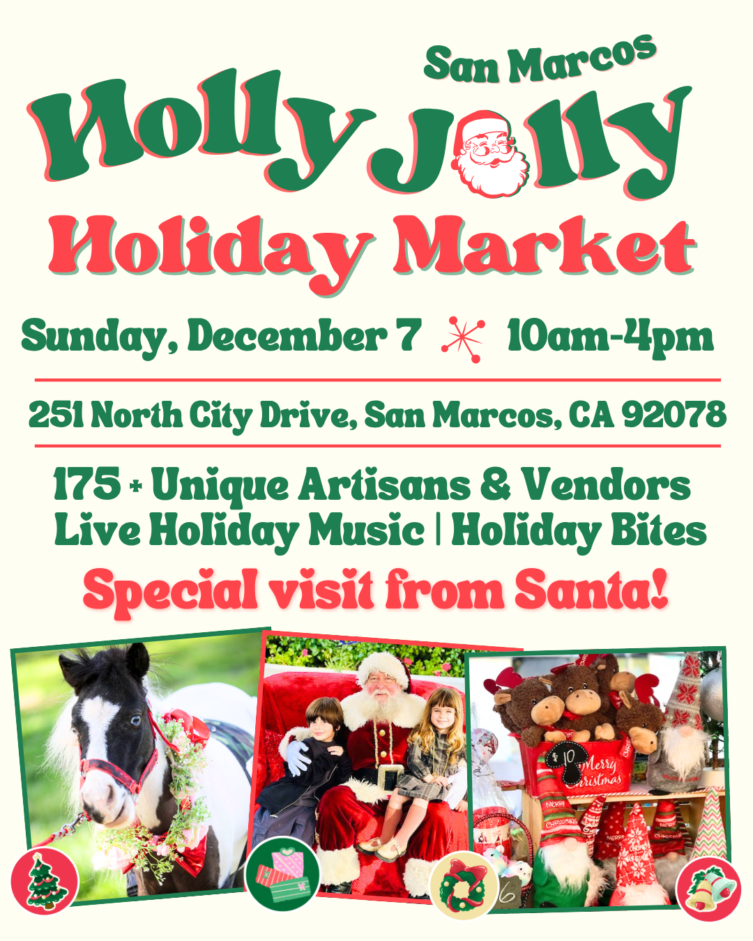 ‘Tis the season to stroll, shop, and sparkle! The San Marcos “Holly Jolly” Holiday Market returns to North City with a full day of merry-making, magical moments, and gifts you will not find anywhere else.