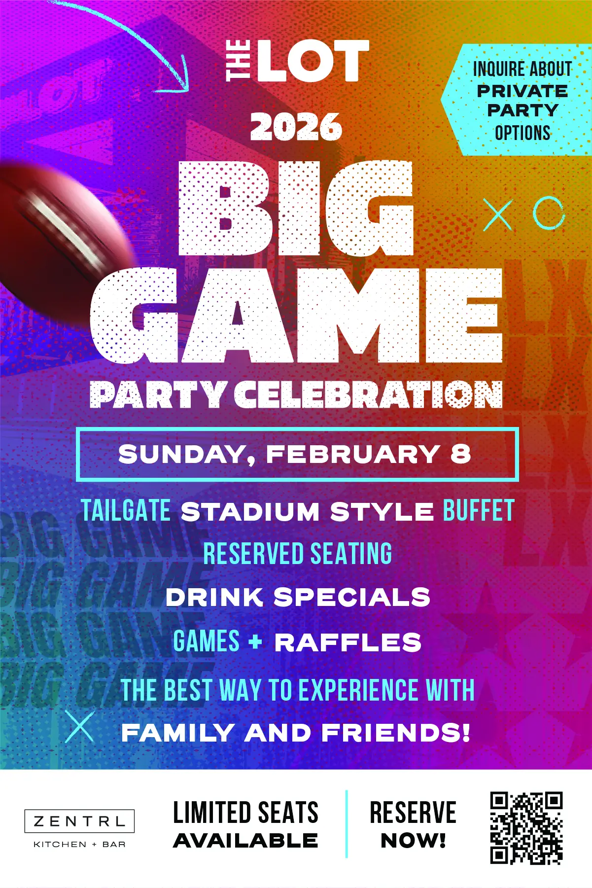 Join us for the 2026 Big Game Party Celebration, where the Big Game takes over the entire space. Feel every moment on our 150-inch video wall, with even more screens throughout the location and game sound pumping throughout the entire venue, keeping you locked into every play, reaction, and big moment. Live raffles announced during game breaks and a high-energy crowd create an atmosphere that’s the next best thing to being in the stadium.