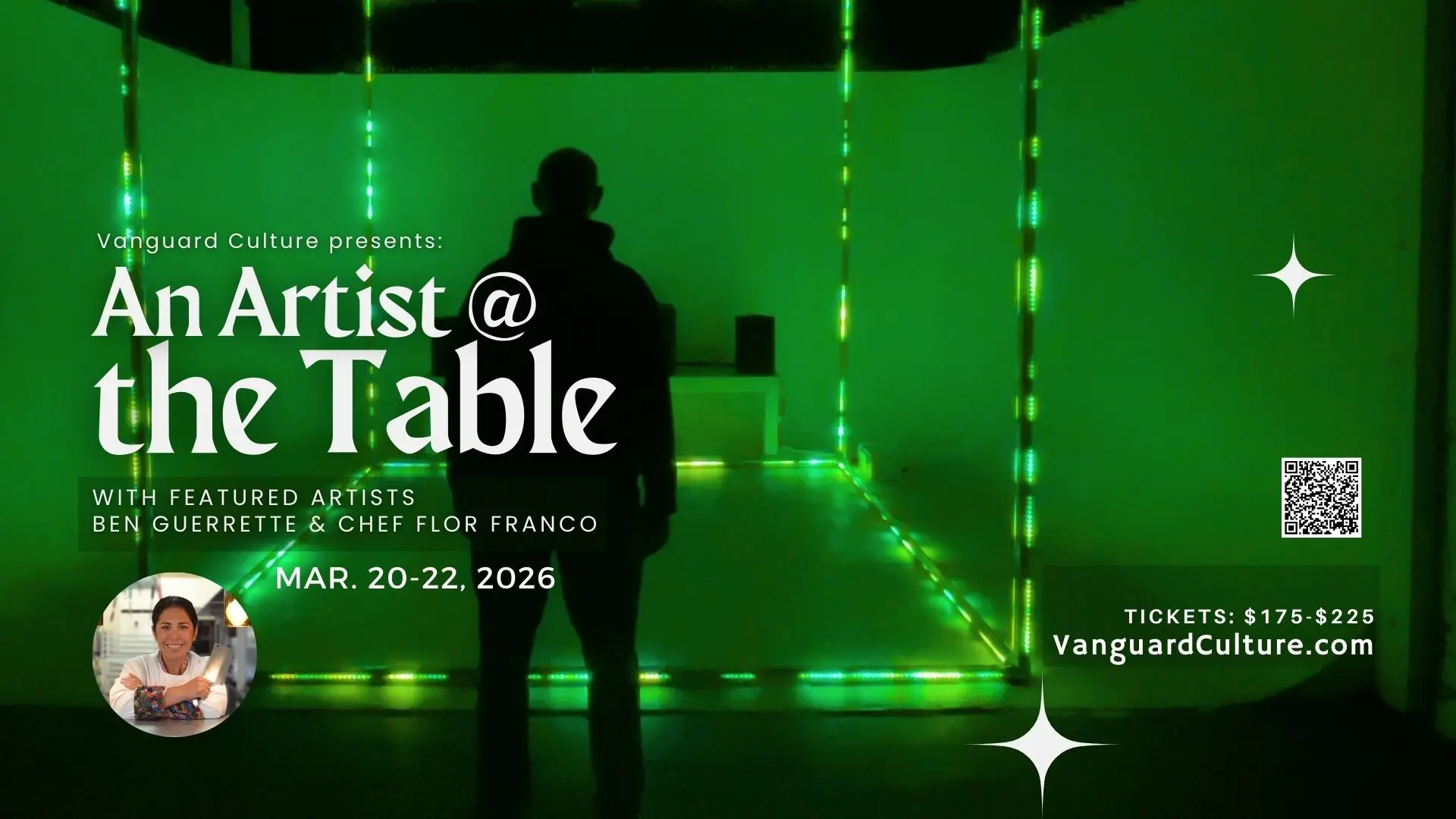 Step inside CHAPEL in Liberty Station, transformed into an immersive light, sound, and video art environment by visionary artist Ben Guerrette. Experience the next chapter of An Artist @ the Table, Vanguard Culture’s signature dinner series pairing visionary chefs with boundary-pushing artists. For three exclusive evenings, Chef Flor Franco will craft a 4-course culinary journey inspired by the immersive artwork of Ben Guerrette, who will transform CHAPEL into a multi-sensory exploration of the four elements—Water, Fire, Earth, and Air.
