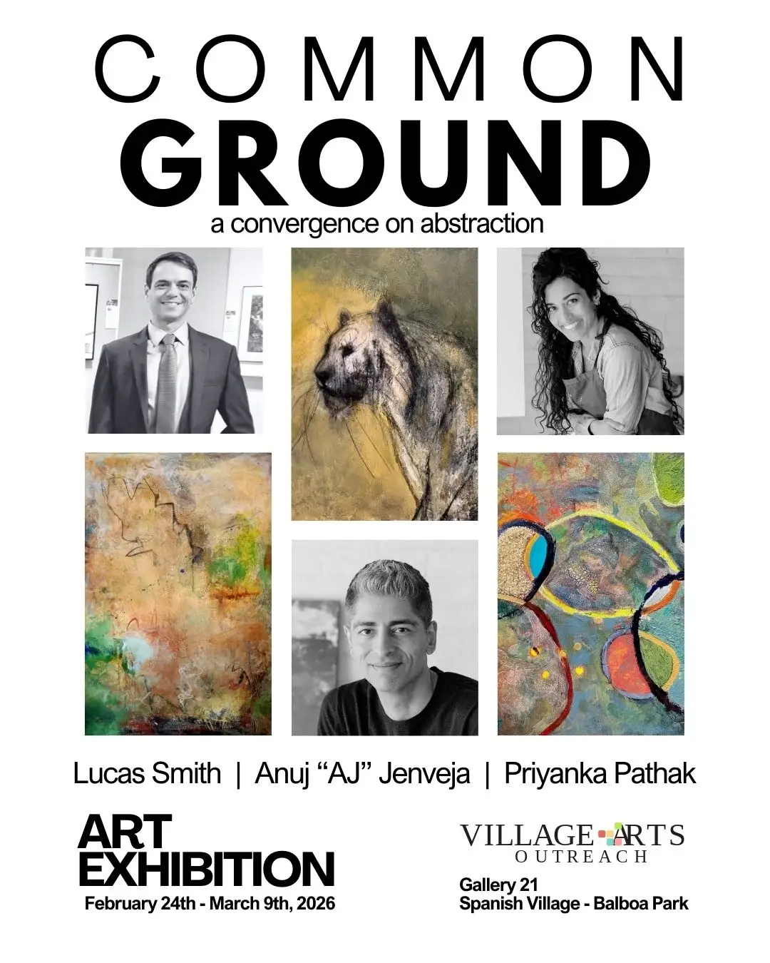 The “Common Ground” exhibition showcases the highly acclaimed work of San Diego artists Lucas Smith, Anuj “AJ” Jenveja, and Priyanka Pathak in a curated group exhibition at Village Arts Outreach (aka Gallery 21) in Spanish Village, Balboa Park.