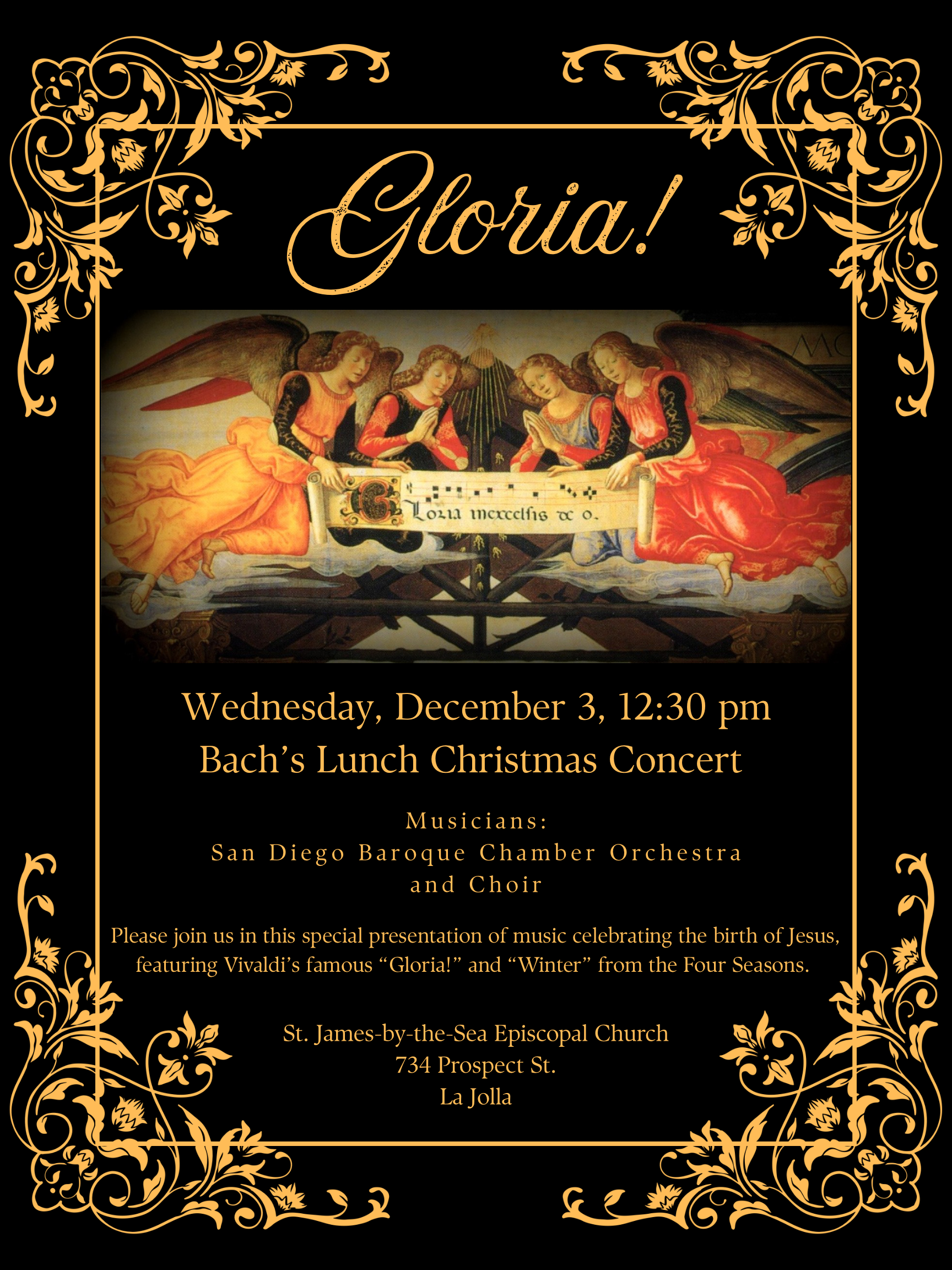 SD Baroque celebrates the Christmas season with Vivaldi’s joyous Gloria RV 589 and “Winter” from the Four Seasons, with a full chamber orchestra and chorus. Featuring Isaac Allen, soloist (Hausmann Quartet, San Diego State University).