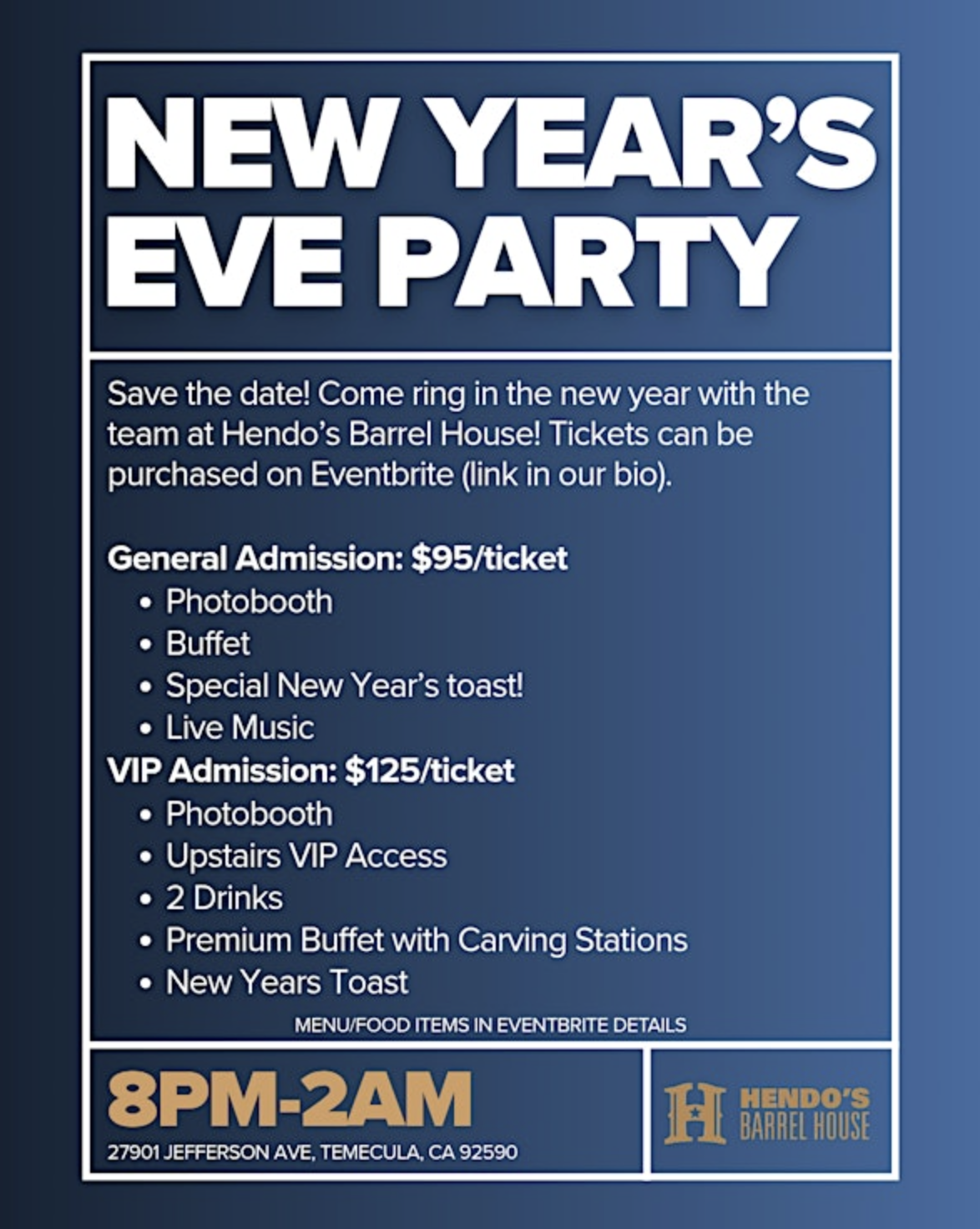 Tickets are available for purchase here: https://www.eventbrite.com/e/hendos-new-years-eve-party-tickets-1976534902099