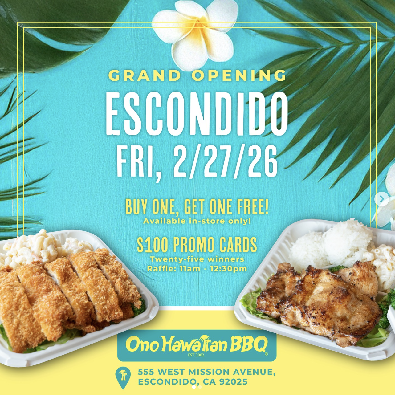Ono Hawaiian BBQ is officially opening its first San Diego County location with a new restaurant in Escondido. The new location will be hosting its Grand Opening Luau on Friday, February 27, 2026, from 11:00 a.m. to 9:30 p.m.