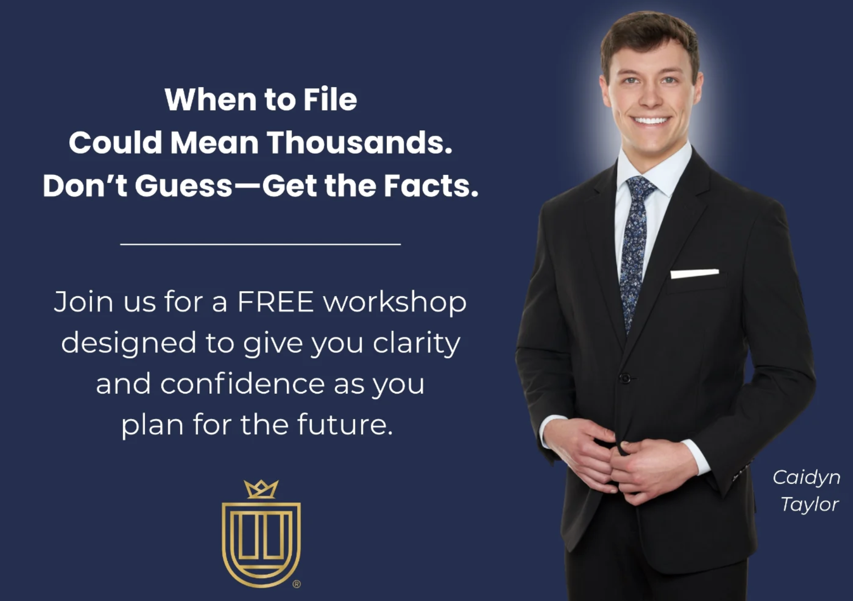 Don’t leave money on the table! Join financial educator Caidyn Taylor for a complimentary workshop designed to demystify Social Security planning.