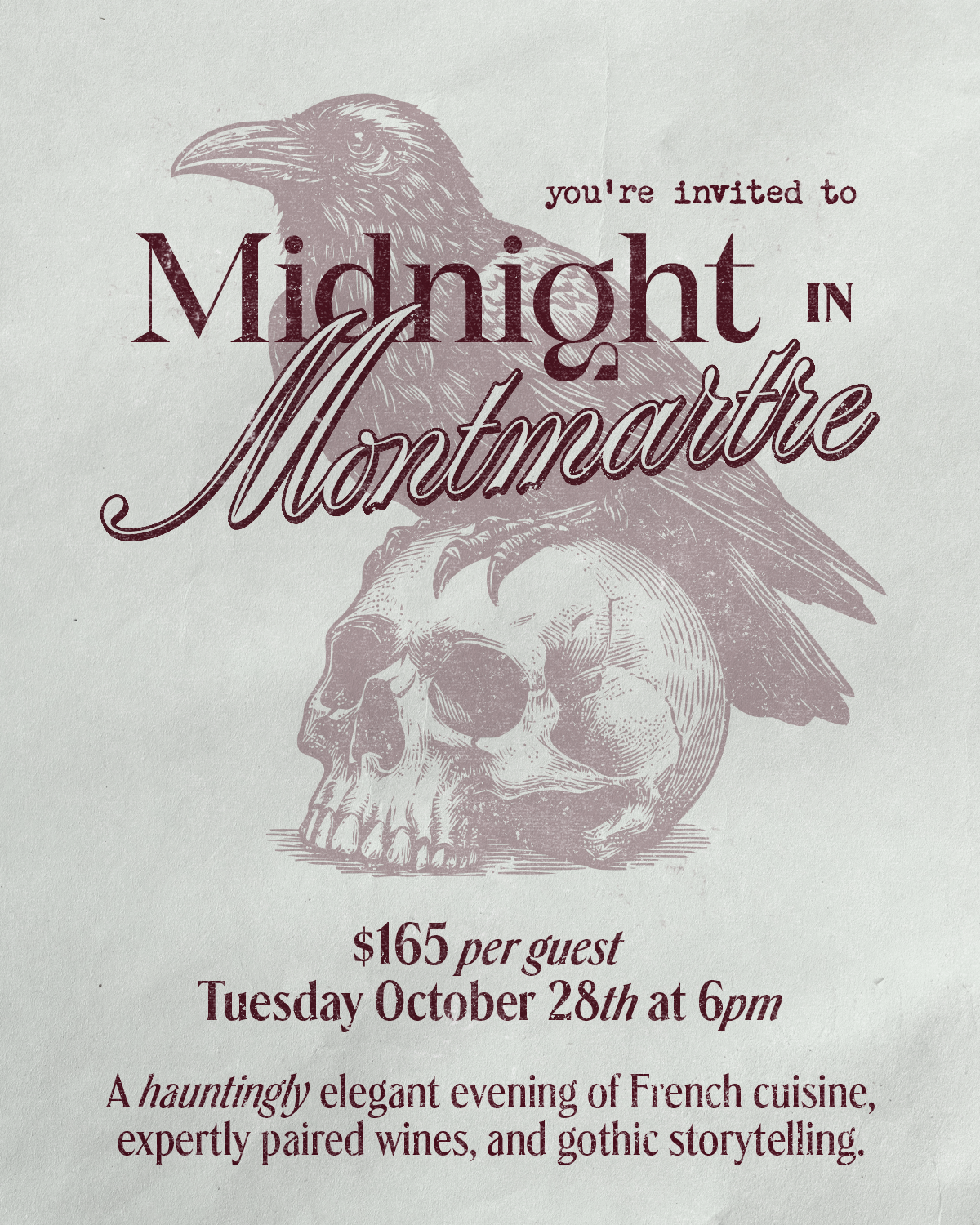Little Frenchie invites you to a night where French elegance meets the mysterious spirit of Halloween. A one-night celebration of French culinary artistry and gothic storytelling. Guests will enjoy a five-course menu, each course paired with wines expertly curated by our sommelier and inspired by the tales shared throughout the evening. Drawing from folklore, history, and classic gothic literature, the stories will set a moody yet festive tone for a night of mystery, flavor, and fun. Costumes welcomed!