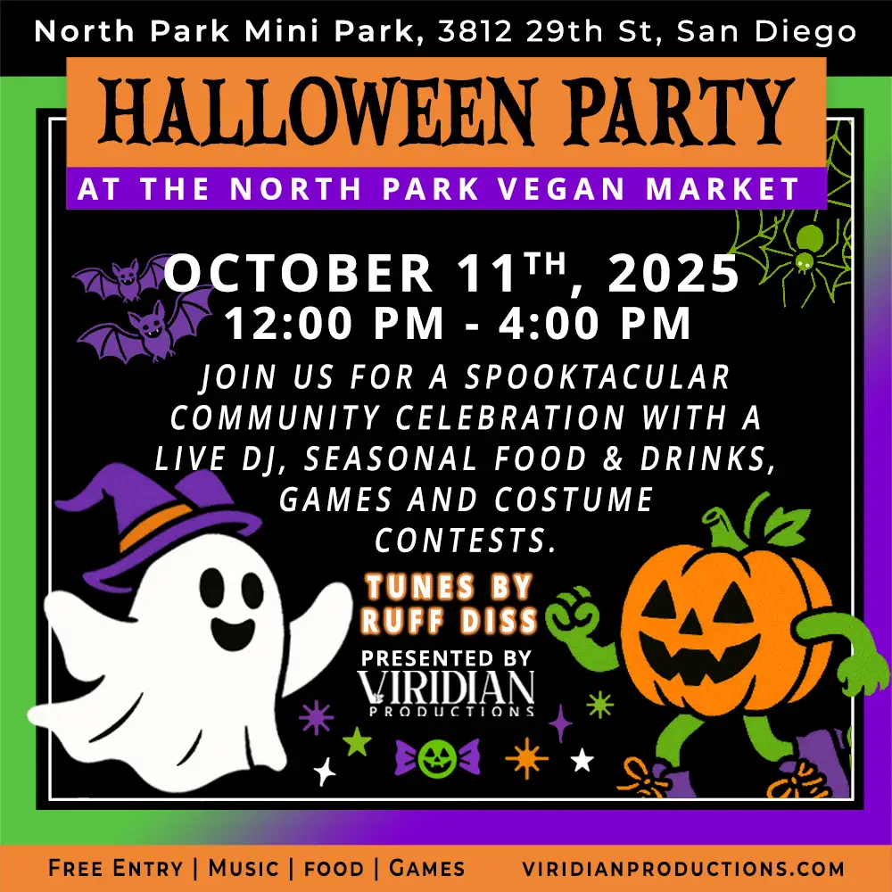 Join us for a spooktacular community celebration including a mini pumpkin decorating station and costume contests with prizes! Bring your favorite people to groove to live sets by Ruff Diss and a few special guests. Come dressed up for a day of Halloween-themed fun. This special event will be happening in the Mini Park during the monthly North Park Vegan Market.