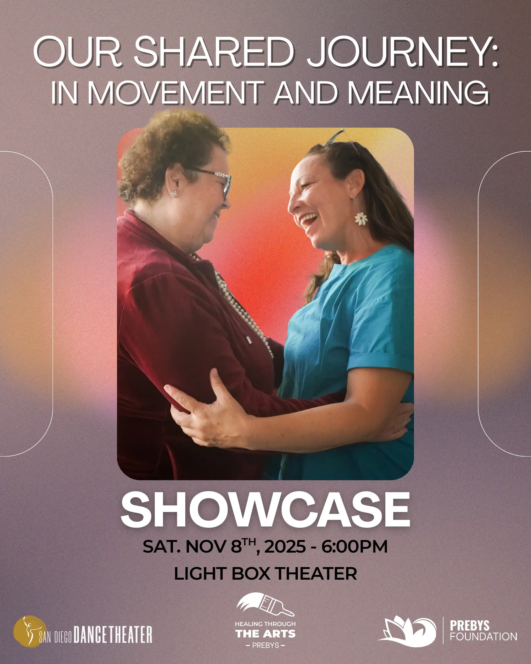 Join us as we celebrate the creativity and resilience of our Aging Creatively program. With support from the Conrad Prebys Foundation and San Diego Dance Theater, Cecily Holcombe, Amal Elwardi, Debra Toth-Ward, and Tina Carreras choreograph beautiful pieces that showcase our local artists, and senior dancers in a multigenerational performance that honors the body’s capacity to move, heal, and inspire at every stage of life.