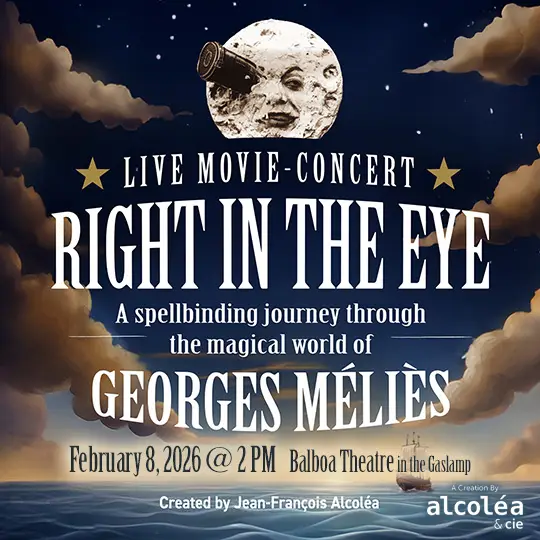 Right in the Eye is a show to experience that embarks audiences, from youngster to seniors, through a fantastic journey. Reviews said about this Five-Star-Show at the Edinburgh Fringe “A magical hour where films, light and music weave a rich tapestry. A unique experience.” Created by Jean-François Alcoléa and praised by the Great-Great-Granddaughter of legendary filmmaker and cinematographer Georges Méliès, Right in the Eye features a captivating, multi-layered score performed by three virtuoso musicians, offering an amazing emotional voyage. Using an extraordinary range of instruments—including piano, percussion, guitar, and unique oddities like the aquaphone, theremin, and even plastic take-out lids—the musicians bring new life to Méliès’ films. Their mesmerizing music evokes the technical wizardry and playful creativity that defined his work.