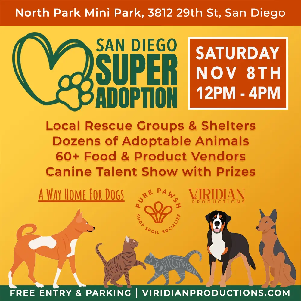 Join local rescues and shelters to meet adoptable dogs. Connect with local organizations that are making a difference and learn about volunteer opportunities, fostering and other ways to help homeless animals in San Diego. Presented by Viridian Productions, Pure Pawsh, and A Way Home for Dogs.