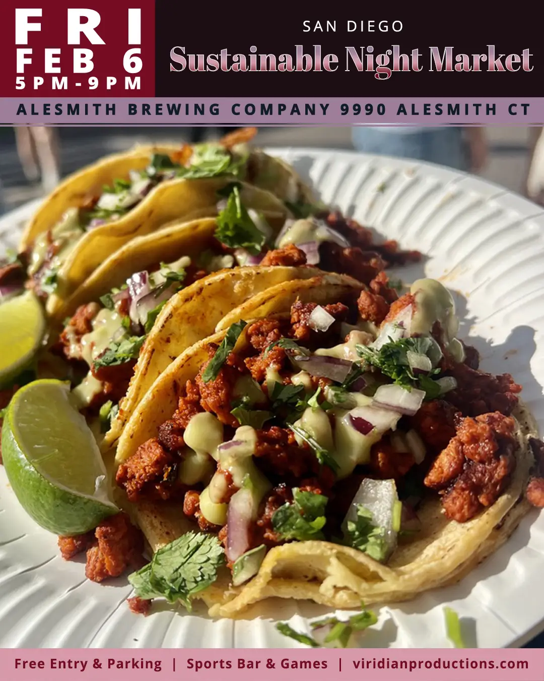 The San Diego Sustainable Night Market is located at AleSmith Brewing Company, an expansive indoor and outdoor venue that features several seating areas, fire pits, golf simulators, ax throwing and other games. It’s the perfect spot to gather and share food, drinks and good times. There is a free parking lot onsite and free street parking nearby. This is a rain or shine event.