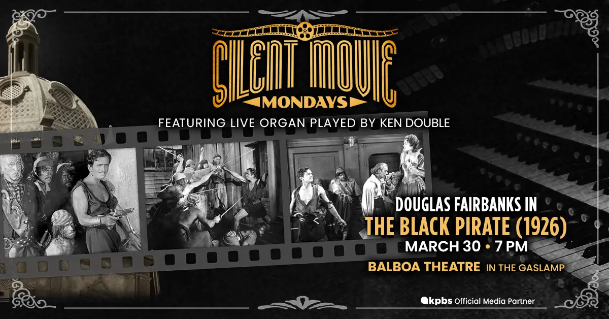 Douglas Fairbanks returns to the Balboa Theatre screen – this time, in color! He stars as The Black Pirate, a shipwreck survivor hell-bent on vengeance who fights and tricks his way into becoming a pirate captain.
