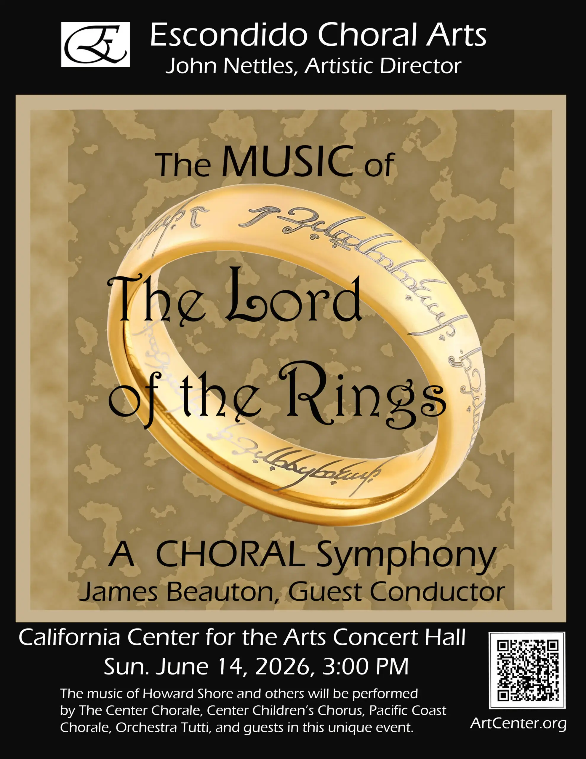 Join The Center Chorale, Pacific Coast Chorale, Guest Singers and Soloists with Orchestra Tutti of San Diego for a presentation of a symphonic work written for The Lord of the Rings trilogy by J.R.R. Tolkien. This exciting work from the Tolkien films includes 85 instrumentalists, 100 singers, soloists, and children’s chorus creating a long-lasting impact for singers and audience alike. The music of The Lord of the Rings by Howard Shore is counted among film scores most complex and comprehensive works. This unique performance allows the music to bear the narrative weight of the films creating a new and dramatic live concert experience. This collaborative event includes performers across the county providing creative arts experiences that enhance the vibrancy of our community for performers and audience alike.