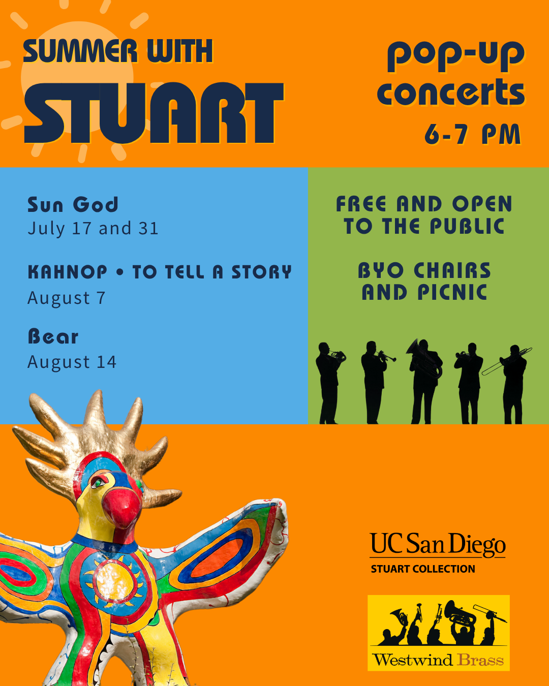 Get ready for an enchanting evening as Westwind Brass brings the vibrant sounds of Dixieland, Jazz, and Americana to the iconic Sun God sculpture by Niki de Saint Phalle at the UCSD Stuart Collection! As the sun sets, let the brass fill the air with rhythms that celebrate American musical heritage.