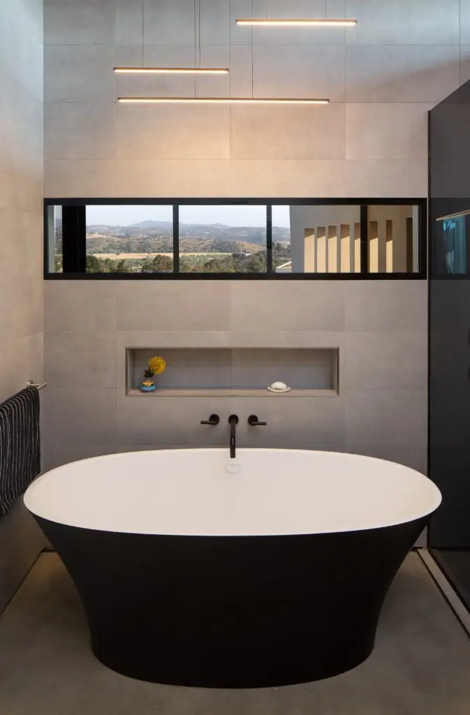 His instincts for composition and his meticulous attention to detail are apparent throughout the Zaleschuks’ house. Built by Fallbrook’s MLA Contractors, the home is long and low, energized by angular side walls that look like outstretched arms. The place has idiosyncrasies, yet it fits the rural site. Sharp edges are visible from surrounding roads and hills, but unlike Xeroxed vineyard homes—which tend to stand out from their lots due to their height and faux historical detailing—the Zaleschuks’ home hugs the land, and its minimalist lines pick up the patterns of the vineyard.