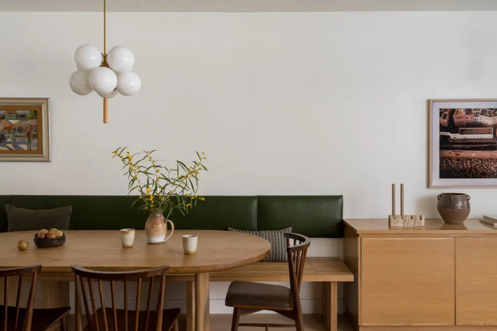 Within the kitchen sits a breakfast nook featuring a custom-built bench and green leather backrest highlighted by vintage ceramics from Comman Goods and a pendant from Triple Seven Home. “We incorporated this built-in console in the corner that takes you into the family room,” De Spain says. “We wanted to make this room feel sort of long and open and connected to the kitchen.”