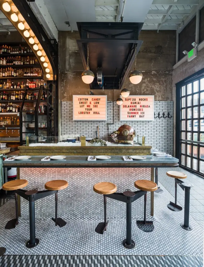 “I framed the oyster bar as a complete composition, letting the patterned floor lead the eye toward the counter and the shelving beyond. I made sure to include the rolling library ladder along the back bar, a distinctive design element that emphasizes the height and density of the floor-to-ceiling shelving. I photographed the space at a time of day when daylight enters through the windows while the warm interior lighting still reads, balancing natural light with the glow of the bar. I approach restaurant interiors by deciding what to include and what to leave out, so the atmosphere and structure of the space can come through in a single frame.”