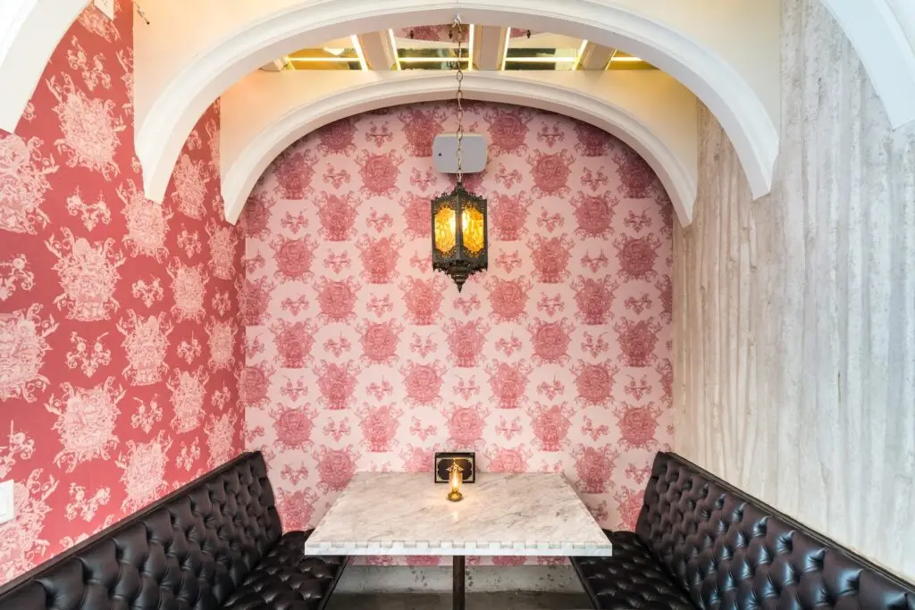 Kindred is one of those interiors people in San Diego remember—[it’s] bold, moody, and unapologetically its own. I was drawn to this booth vignette because it captures that signature contrast: black tufted seating against pink patterned walls, framed by repeating arches and reflective ceiling panels that amplify the lantern glow. When I photograph restaurants, I focus on more than wide angles. I look for intimate moments where the design language is distilled into a single frame. This is where the personality of a space lives—in the textures, color, and atmosphere guests experience up close.”