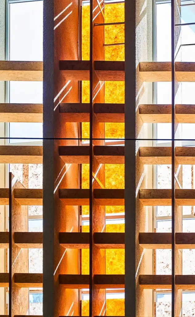 “This image was made while documenting sacred architecture across San Diego for the La Jolla Historical Society. With private, individual access to the building, I spent time observing how light moved through the structure and illuminated its materials. The layered wood framing and warm translucent panels create a rhythm of structure and glow that feels both architectural and contemplative. Photographing spaces like this reminds me how architecture can shape moments of stillness through light, proportion, and materiality.”