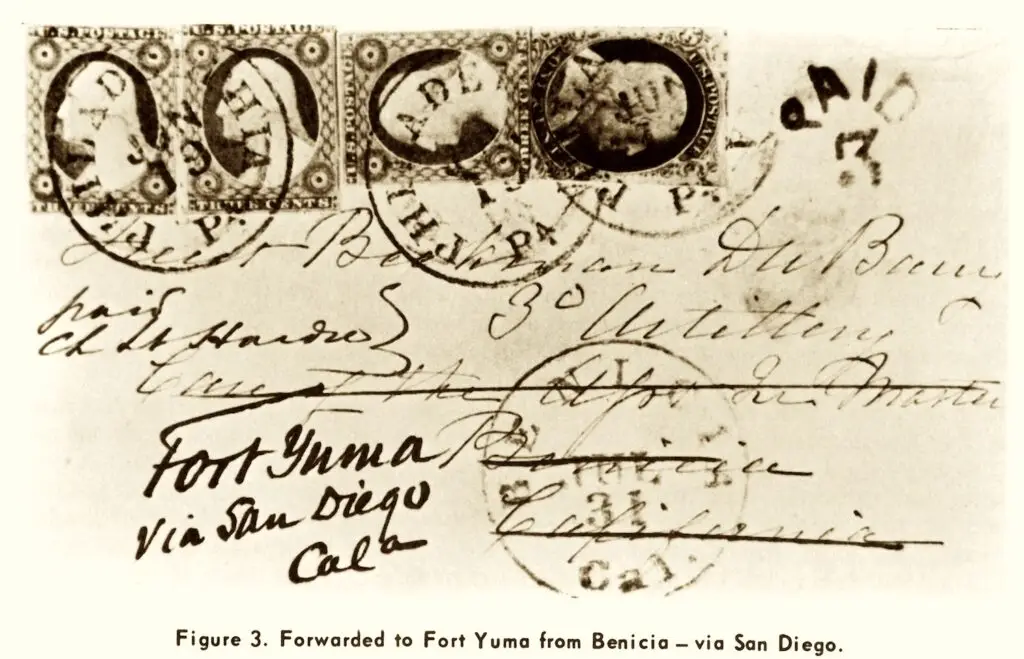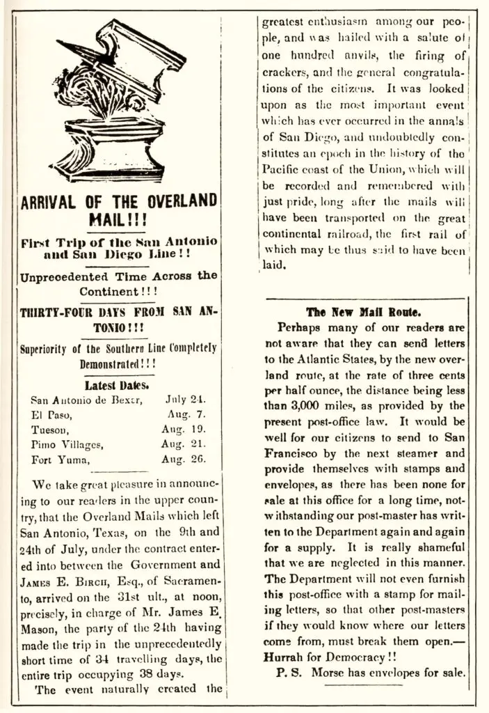 San Diego was isolated from the rest of the US in 1857. Telegraph lines wouldn’t bridge the Sierra Nevada till ’61, and the transcontinental railroad wouldn’t reach us for nearly three decades. Mail from all parts east had to come on steamwheelers by way of Panama, pre-canal.