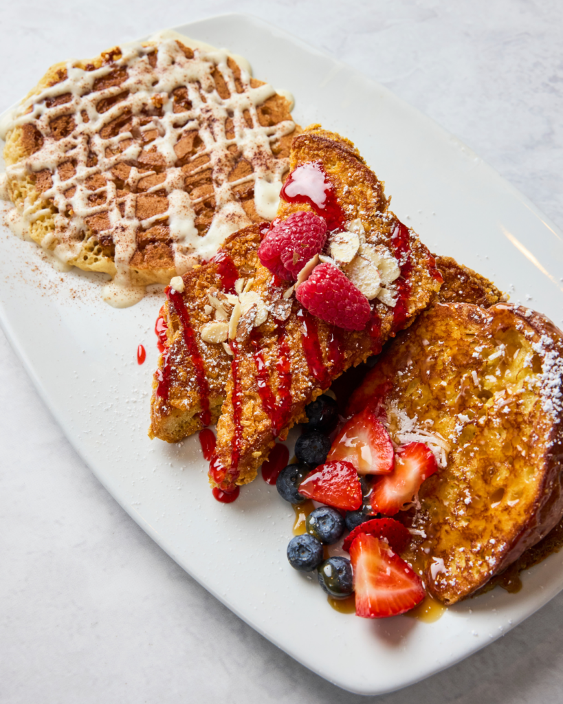 Tiki Toast—three extra thick slices of King’s HawaiianTM sweet bread, topped with strawberries, blueberries, shredded coconut, caramel drizzle, and powdered sugar