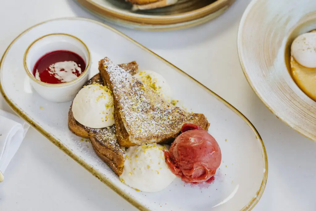 French Toast—mascarpone cream, raspberry coulis, and pistachiootatoes
