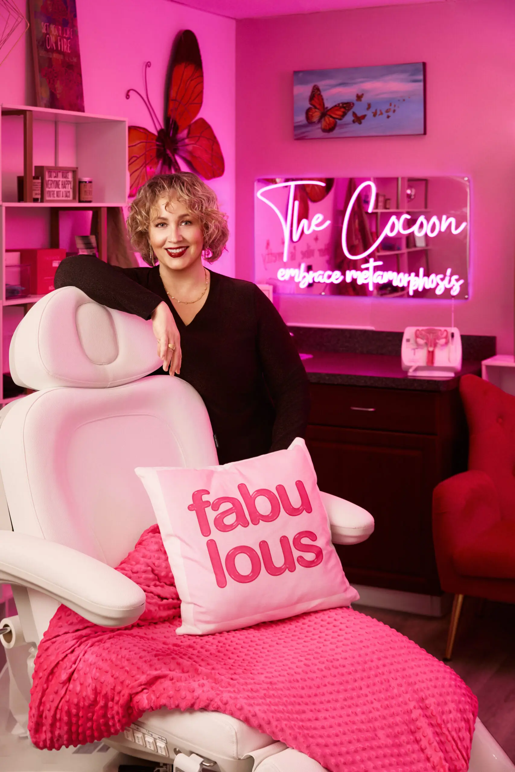 It’s a fairly novel concept: Make pap smears—wait for it—fun. Dr. Kari Lynn Purcott knows that taking care of your health is something worth celebrating, so her Vista office, Paps & Martinis, feels like a party, with sunshine-yellow and pink walls, disco balls, rockstar portraits, soothing scents, and velvet chairs. A far cry from the fluorescent-lit, clinical exam rooms of the typical doctor’s office, spaces like “Princess Street” and “The Cocoon” glow in soft purples and pinks, with neon signs that will prompt a smile and one chair perfectly framed beneath a mural of wings.