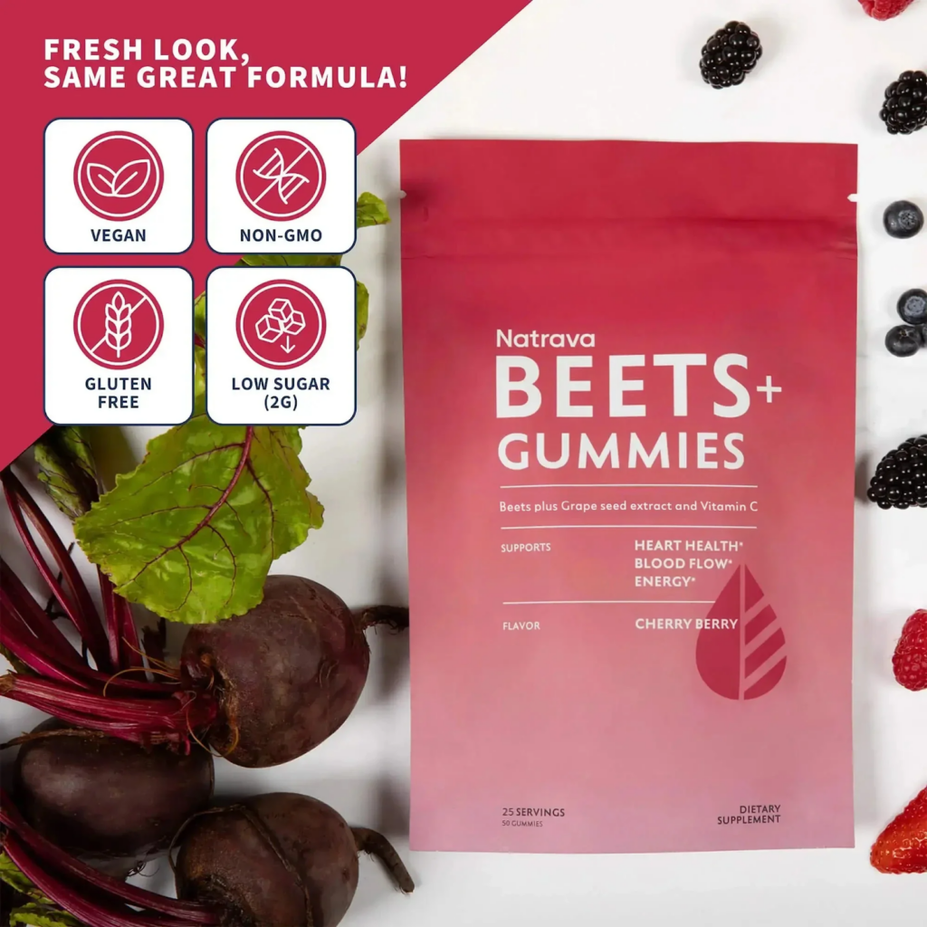 Natrava BEETS+ Gummies check all these boxes. The formula provides clinically relevant doses (350mg of 20:1 beet extract plus 11.5mg of grape seed extract), complete transparency with exact amounts, published third-party testing, and just 2 grams of sugar per serving.