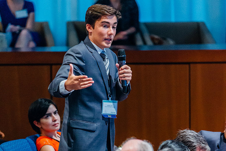 Youth leader Garret Hoff engages and impresses Peter Salk, Huma Ahmed-Ghosh, Anita Raj, Jay Silverman and several other thought-leaders who attended the A4E Global Empowerment Summit. | Photo by Calit2