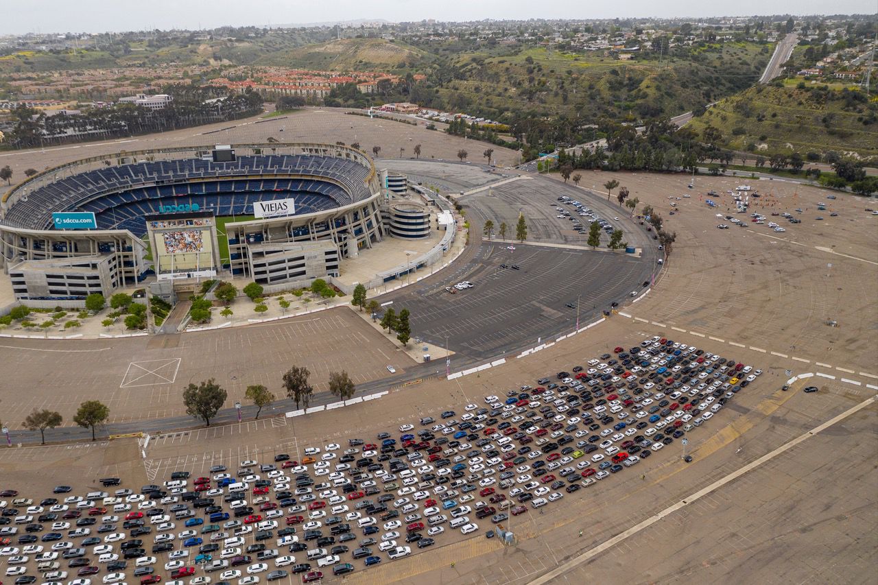 The line of cars at the Mission Valley stadium, which Feeding San Diego has used as a distribution center.