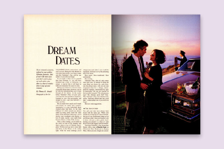 It was only 33 years ago, but “Dream Dates” is a reminder of how modern life has changed everything about dating—the way we meet, plan (or not plan) a date, what we do on the date, and how long it lasts. The purpose of the date seems to have changed as well. At least in our February 1986 issue, we emphasized romance (watching the sunset in matching outfits, anyone?). But while we were planning this month’s feature (page 64), the word “romance” hardly came up. We were more concerned with providing ideas and places that would facilitate conversation, help readers get to know a person, share a meaningful or novel experience—or, bottom line, have fun.