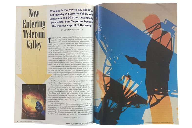 But the big Q is no stranger to San Diego Magazine. In 1997, executive editor Virginia Butterfield took a deep dive into our “Telecom Valley,” documenting the booming industry. Wireless technology was a major innovation back then—the same year the Pathfinder mission landed a rover on Mars, and the Heaven’s Gate cult cast a pall over San Diego.