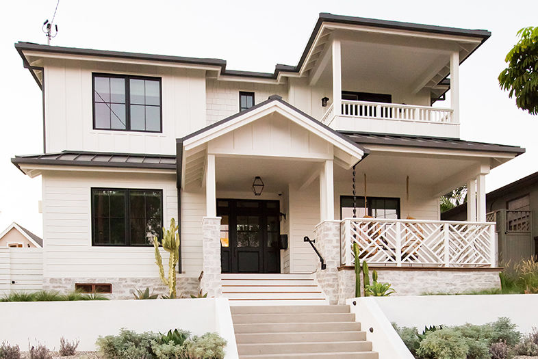 An all-white exterior with stark lines achieves the family’s hopes for a farmhouse curb appeal.
