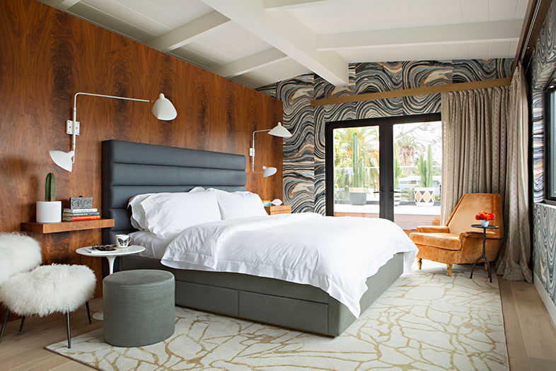 “This bedroom wouldn’t exist without the Robert Crowder wallpaper. The handmade marbling of the ocean blue tones and copper are a perfect foreground to our client’s ocean view. An old tried-and-true technique is to use complementary colors; we used many shades of blue and popped in some rusty orange. We balanced the pop by designing a custom headboard wall of walnut crotch wood, which I designed a walk-in closet behind. I love how all the furniture is harmonized together in scale and shape. The Mongolian hide chair adds whimsy, and the Serge Mouille sconces create a moody layer of light. We captured the cool California feel with sophistication while still paying tribute to Mother Earth.” —Kelly Hinchman, Design Principal, Studio H Design
