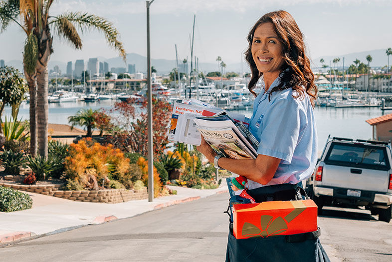 Beginning December 1, Gabriel, 52, puts on her Santa cap and poinsettia earrings and fastens Jon, her Elf on a Shelf, to her hip harness for a little help. Her routine is business as usual: Clock in at the post office at 8 a.m., spot check her vehicle, bundle and load her parcels into the back, set off toward her Point Loma route, and then prepare to make roughly 400 deliveries in six hours.