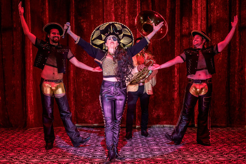 Roxane Carrasco is smashing as Lucha Grande—singer, deadly crime lord widow, dominatrix—backed up by two go-go dancers (Daniel Ramos III and Salomón Maya) who double as ridiculously over-the-top narcos, and by Sousaphone player Adrian Kuicho Rodriguez, in a nonspeaking yet totally charismatic presence. Fellow Culture Clash cofounder Ricardo Salinas plays a squirrely priest caught in the middle of all the players trying to murder or marry one another.
